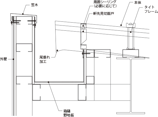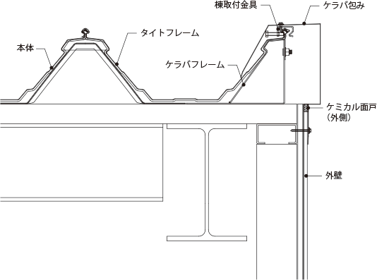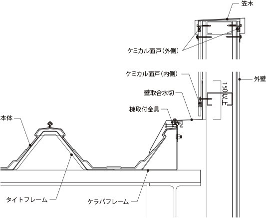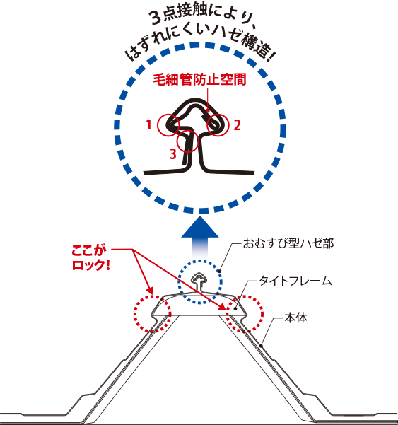 アゴ付折板と強固なタイトフレームがロックすることで、接合部の耐風圧強度が従来に比べ、約2倍アップしました。また、おむすび型ハゼ部に毛細管防止空間を設けることでハゼ部の水密安全性が格段に向上しました。