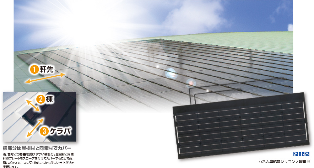 太陽電池において優れたノウハウ、実績を持つカネカ太陽電池の採用によりパーフェクトルーフの美しさを活かした独自の設置工法が誕生しました。街の景観はもちろん、地球環境にも配慮したパーフェクトルーフの新しい個性です。